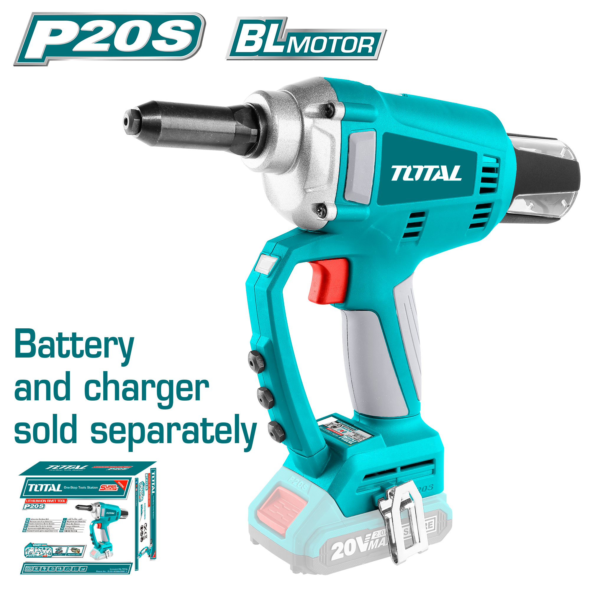 Brushless motor Voltage:20V Pulling force :20kN 25 mm stroke sets most rivets in one stroke Integrated work light Battery and charger sold separately Packed by color box