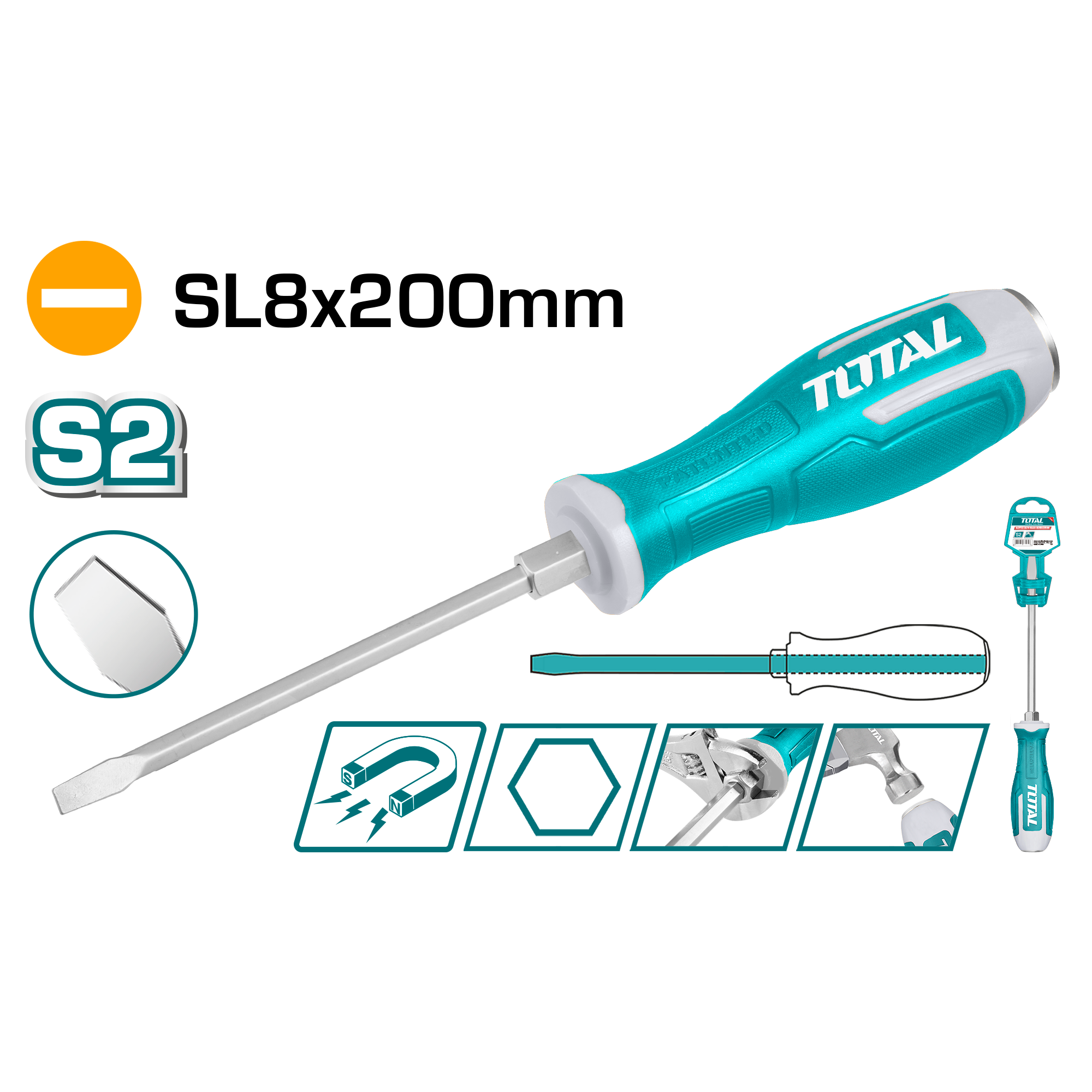 1pcs screwdriver with 1pcs plastic hanger S2 industrial steel , Hex shank Slotted:8mm Shank:8.0mm Length:200mm Packed by plastic hanger